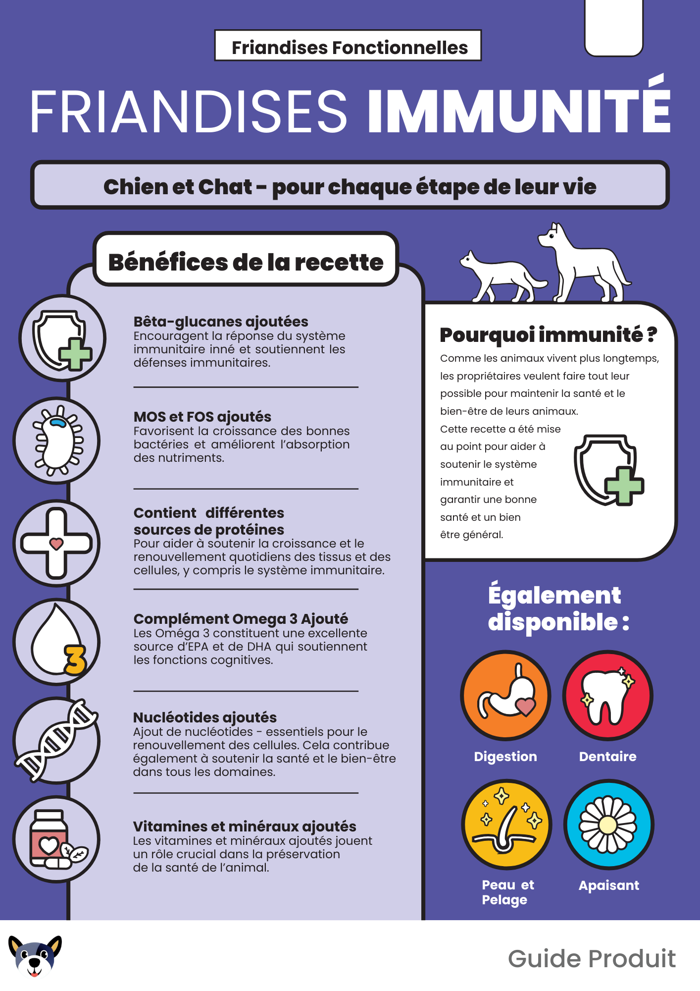 Découvrez nos friandises immunitaires élaborées avec soin pour soutenir et renforcer le système immunitaire de votre compagnon à quatre pattes.